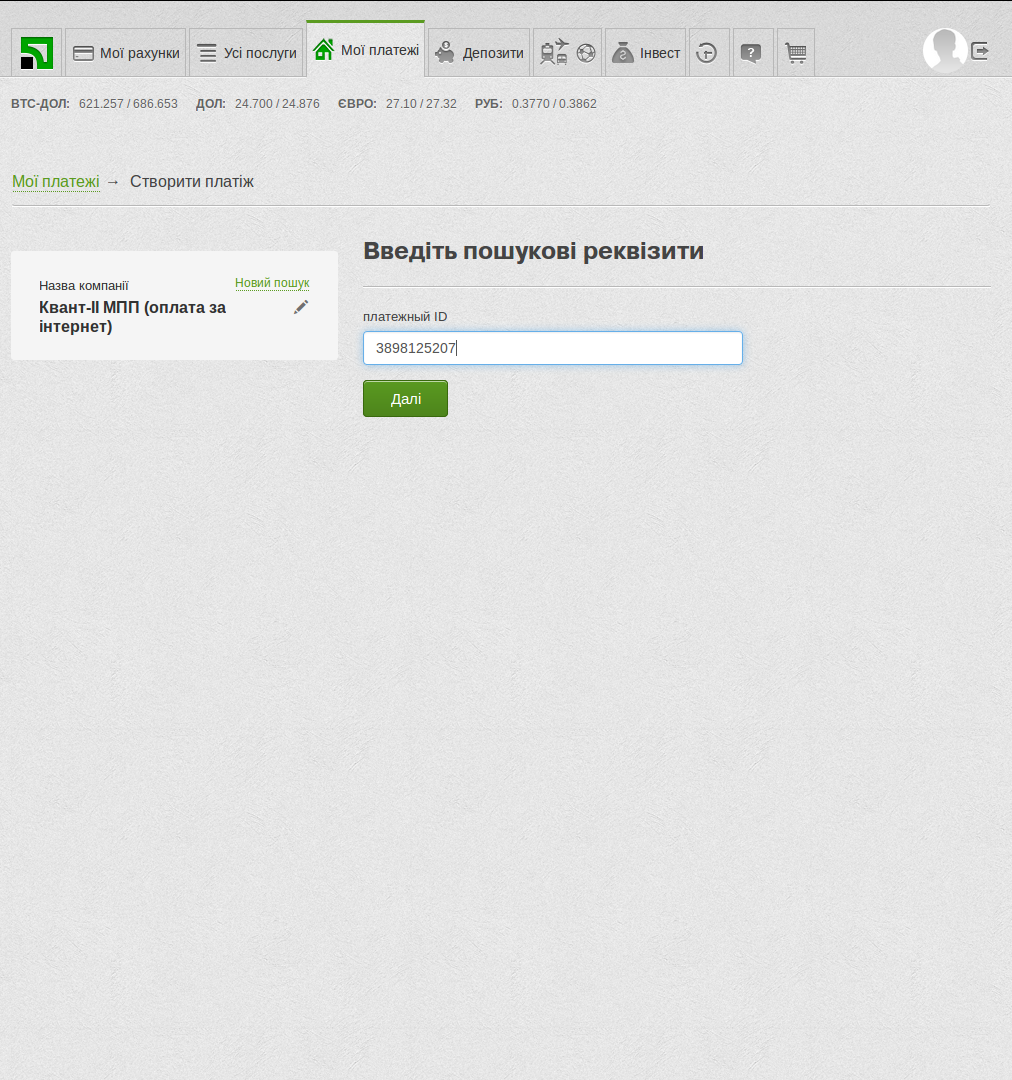 3. Введіть ваш особовий рахунок (Платіжний ID), який ви можете дізнатися на головній сторінці кабінету користувача, та перейдіть до наступного кроку, натиснувши кнопку "Далі".